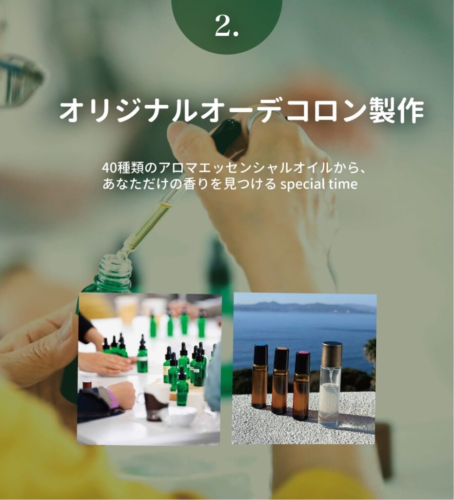 約40種類のエッセンシャルオイルから作る自分だけの香水作りと錦江湾を一望できる大自然の中で「心の洗濯」そしてランチ&ハーブティーで至福の時を堪能してください。