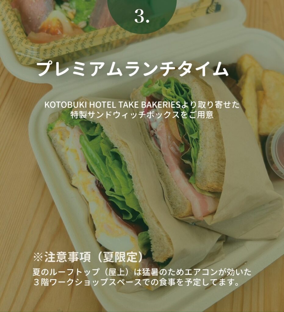 ※雨天、酷暑、強風の時はワークショップルームが食事会場になります。